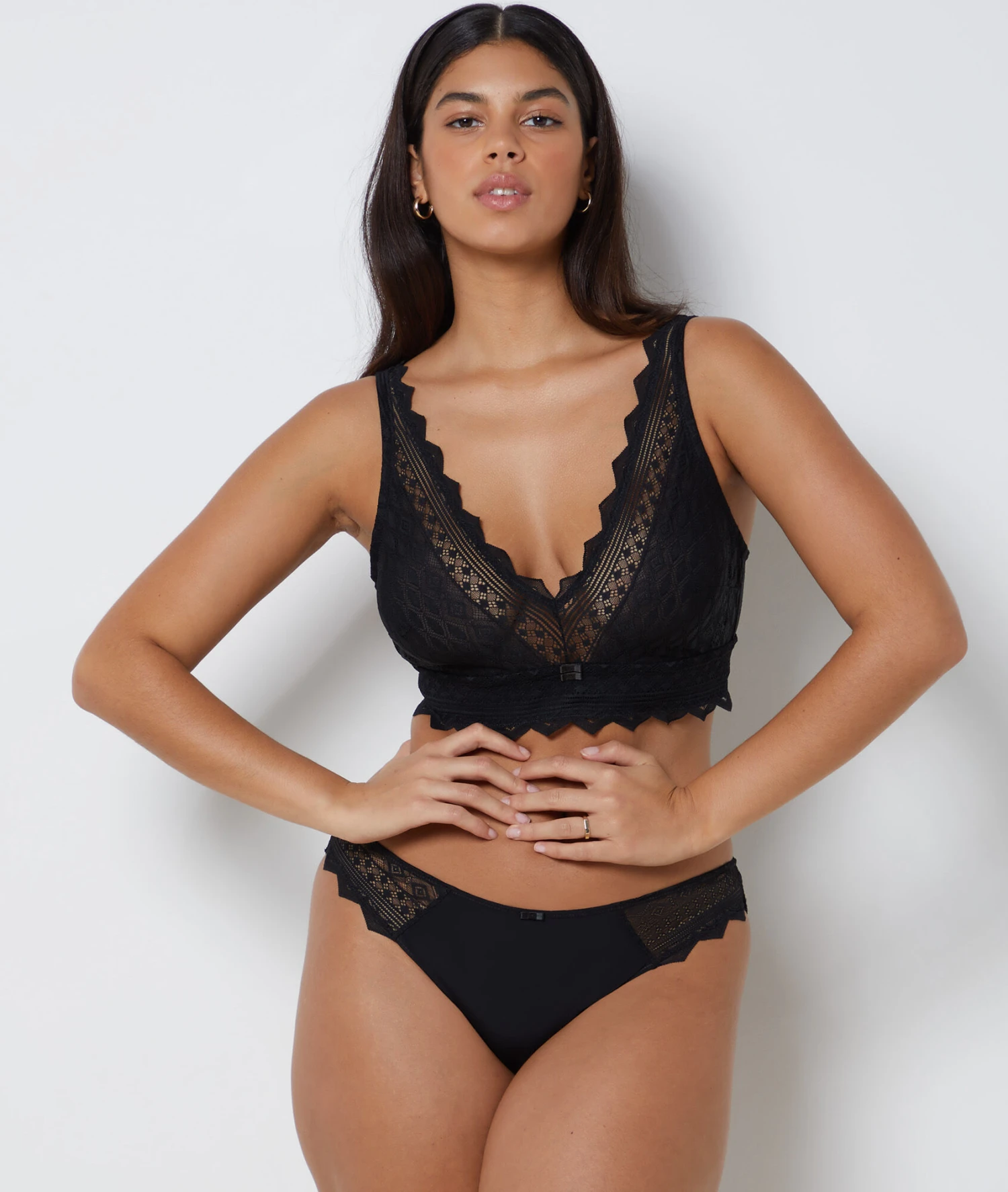 Eine Dreiecksform ohne Schalen und Bügel? Ja, warum nicht! Speziell für die Körbchengrößen D und größer – für guten Halt – aus Spitze, die dezent transparente Muster auf die Haut zeichnet.