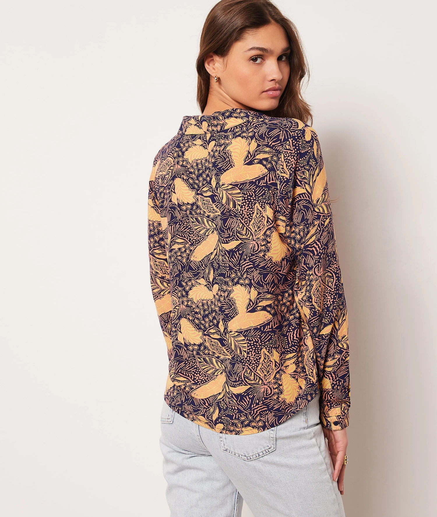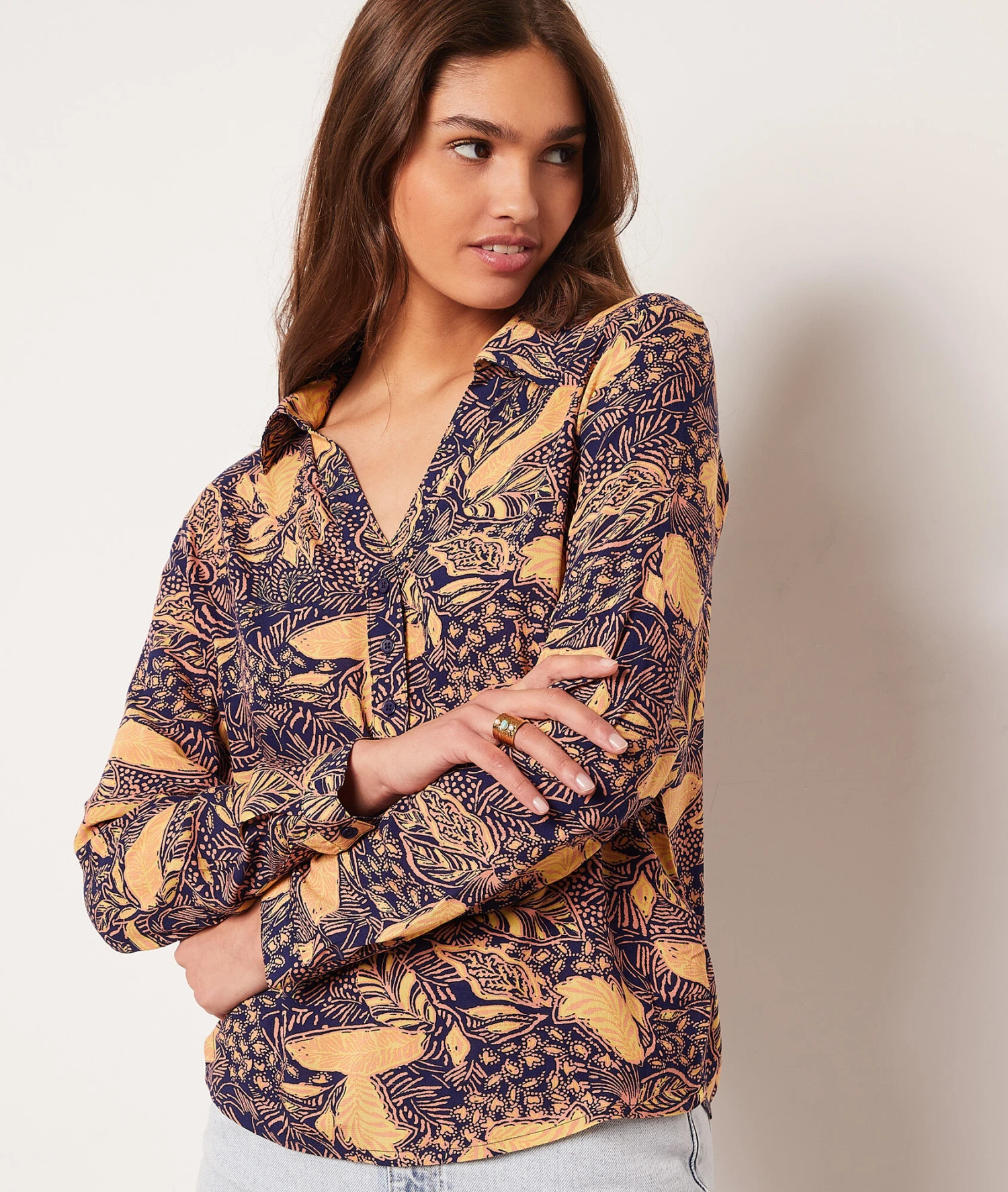 Weiche Bluse mit langen Ärmeln und unserem Lieblingsprint ist eines der modernen Must-haves, die Sie unbedingt in Ihrem Kleiderschrank brauchen. Mit einem Strickpullover zu einem trendigen Outfit zu kombinieren.