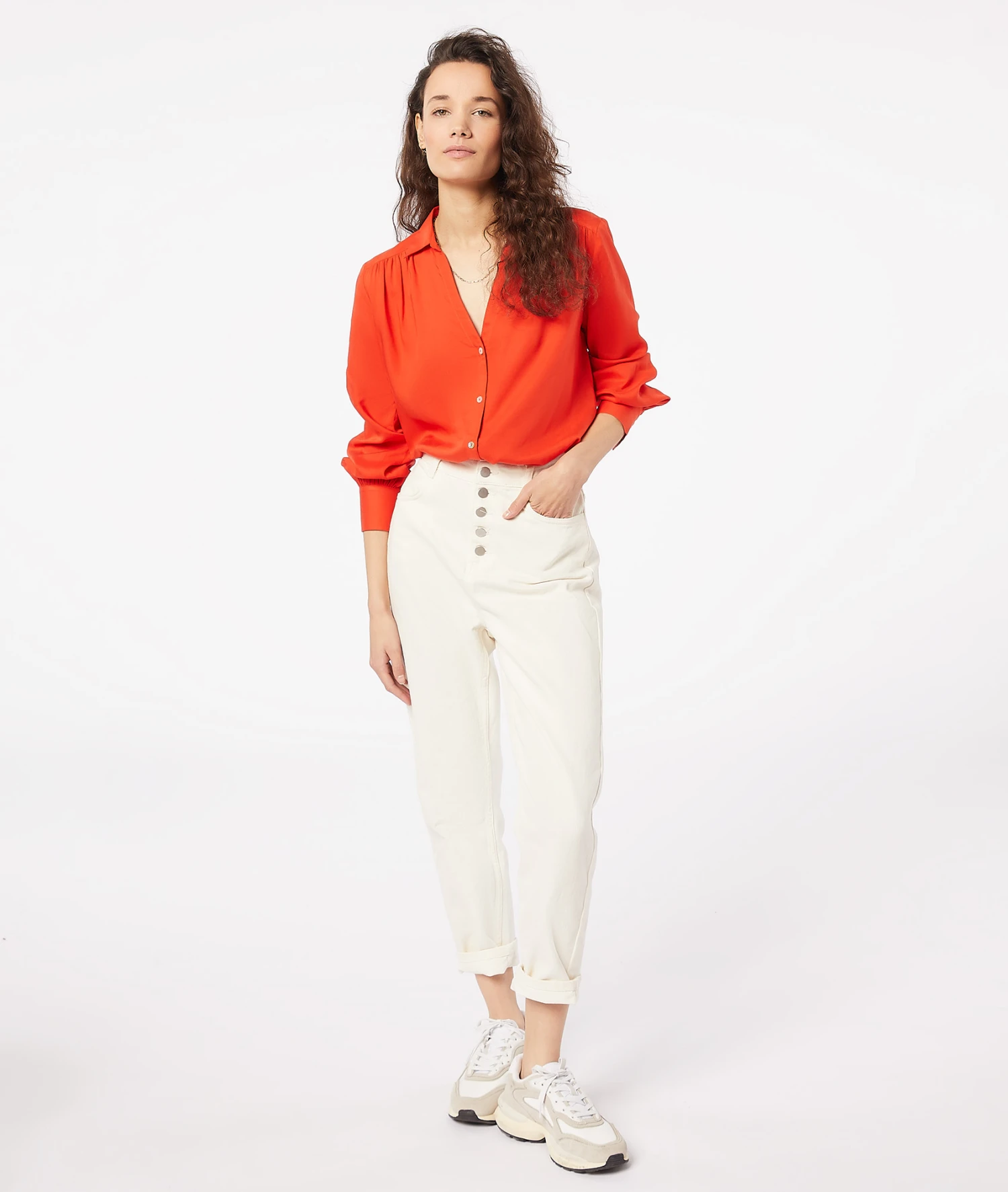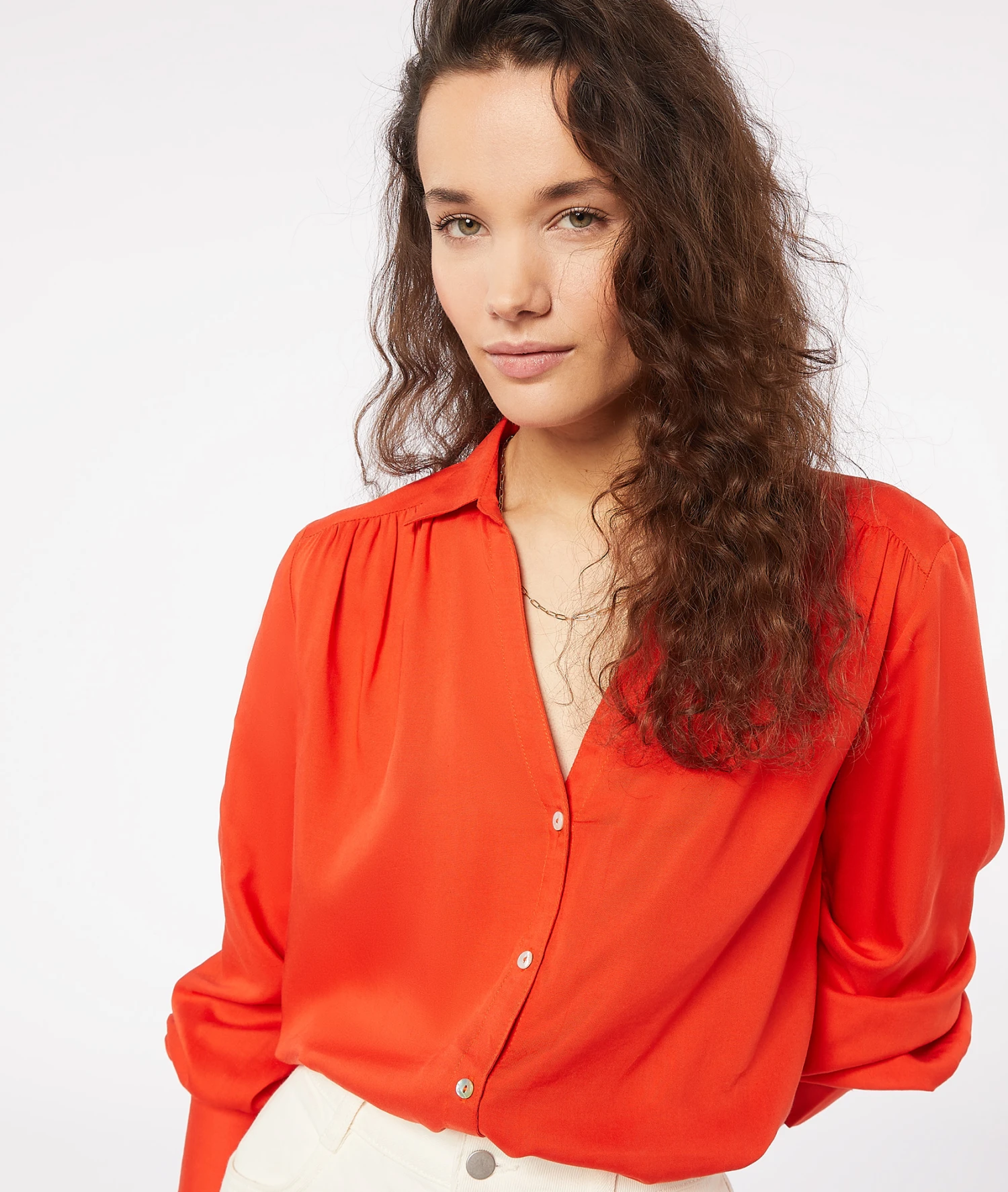 Dieses fließende und sehr angenehm zu tragende Hemd ist ein echtes Basic für Ihre Garderobe. Der geknöpfte Ausschnitt und die feminine Wirkung durch die Kräuselfalten an den Schultern sind einfach unwiderstehlich. Es passt perfekt zu Ihren Jeans und Röcken, um Ihren Looks zu dieser Jahreszeit ein wenig Farbe einzuhauchen.