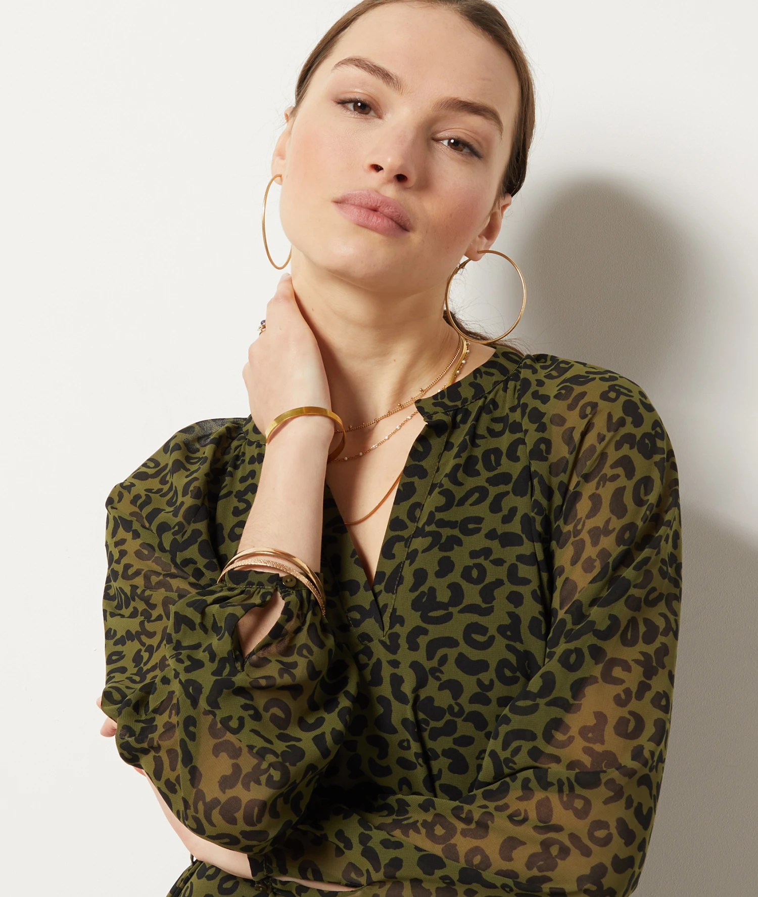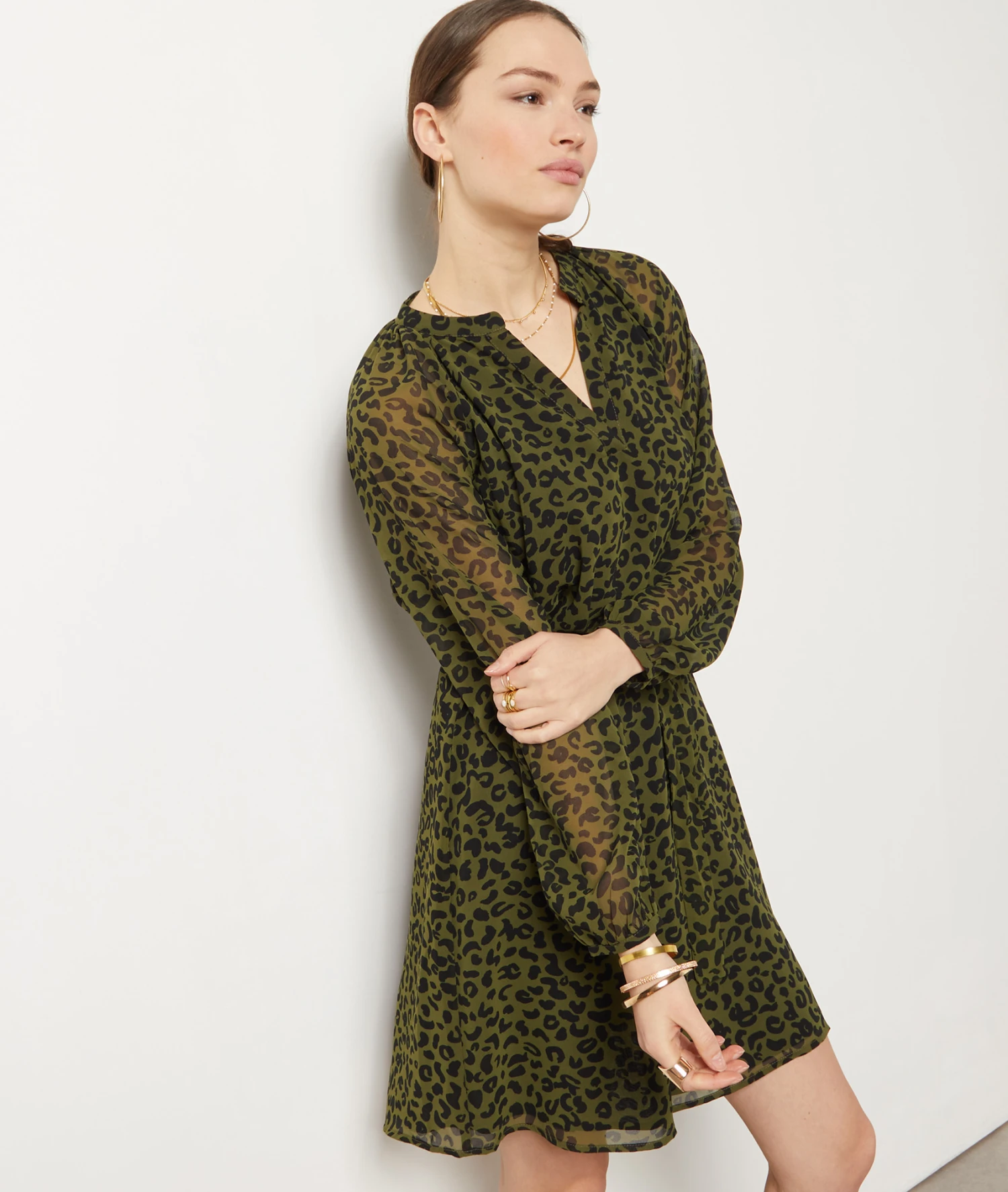 Kleid mit V-Ausschnitt und langen Ärmeln– ein sexy und trendiges Outfit. Aus fließendem Material und einem dezenten Animal-Print.