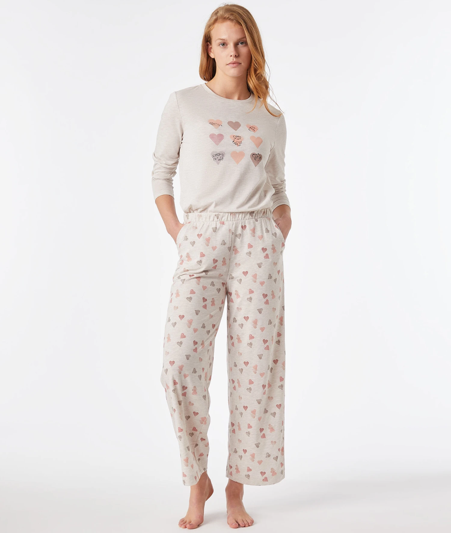 Gönnen Sie sich erholsame Nächte und entspannte Stunden zu Hause mit diesem besonders weichen Pyjama-Oberteil. Das zeitlose Design in sanftem Beige wird durch einen charmanten Herz-Print veredelt und sorgt für ein Gefühl von purem Wohlbefinden auf der Haut. Dank der hochwertigen Verarbeitung aus nachhaltigen Materialien bietet dieses Langarm-Shirt die perfekte Balance zwischen Stil und maximalem Tragekomfort.