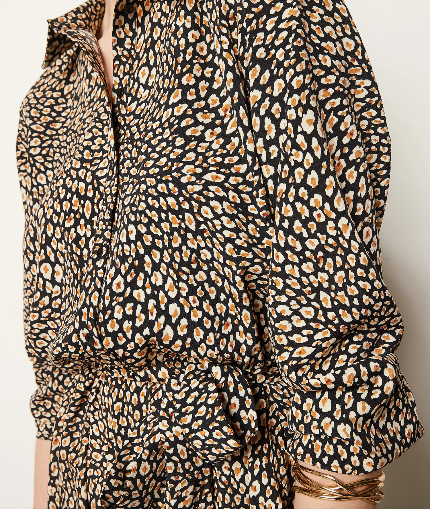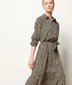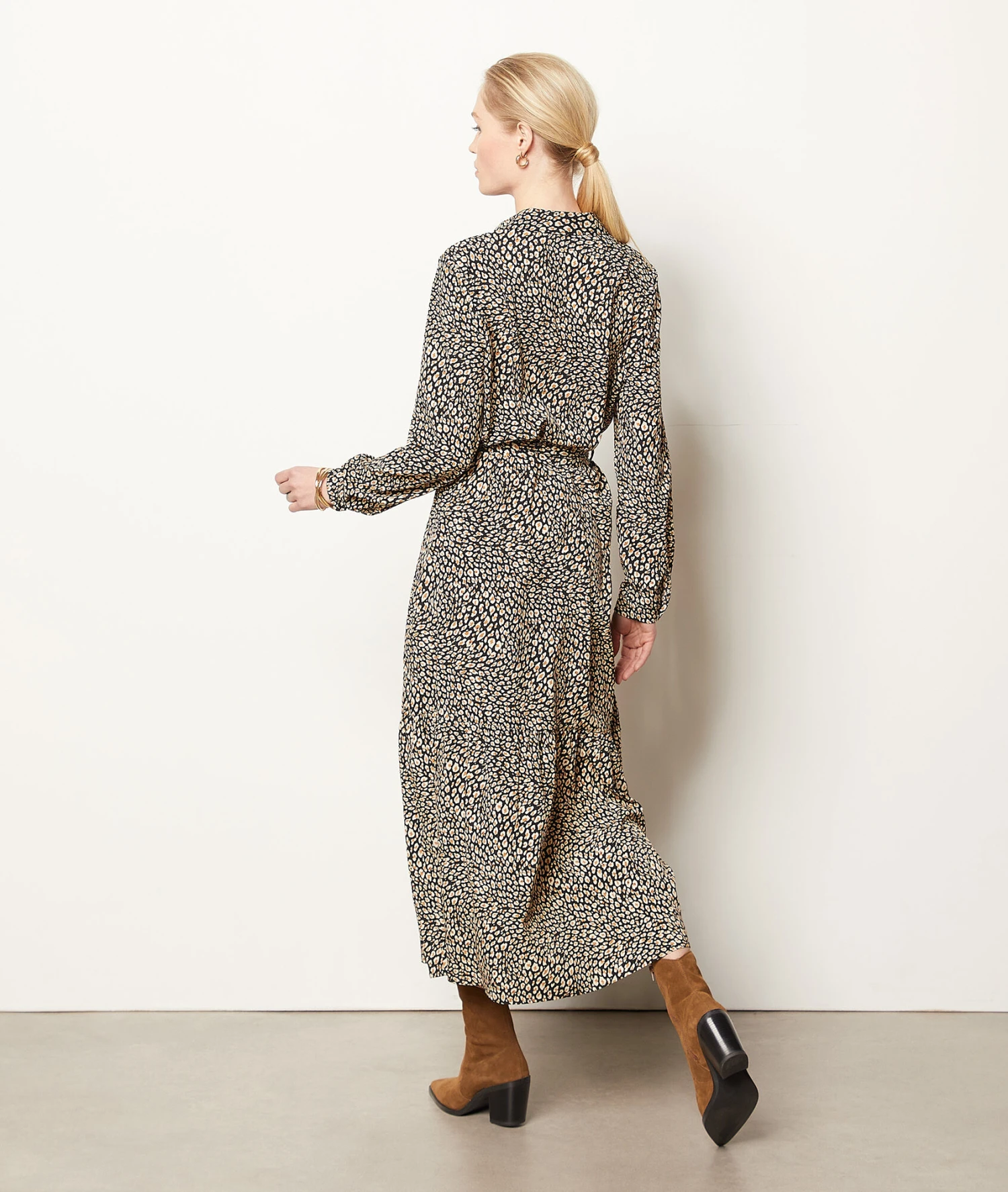 Langes Kleid mit grafischem Print, Knopfleiste, Hemdblusenkragen und langen Ärmeln. Mit dem Gürtel in der Taille zeichnet es die Silhouette auf attraktive Weise nach.