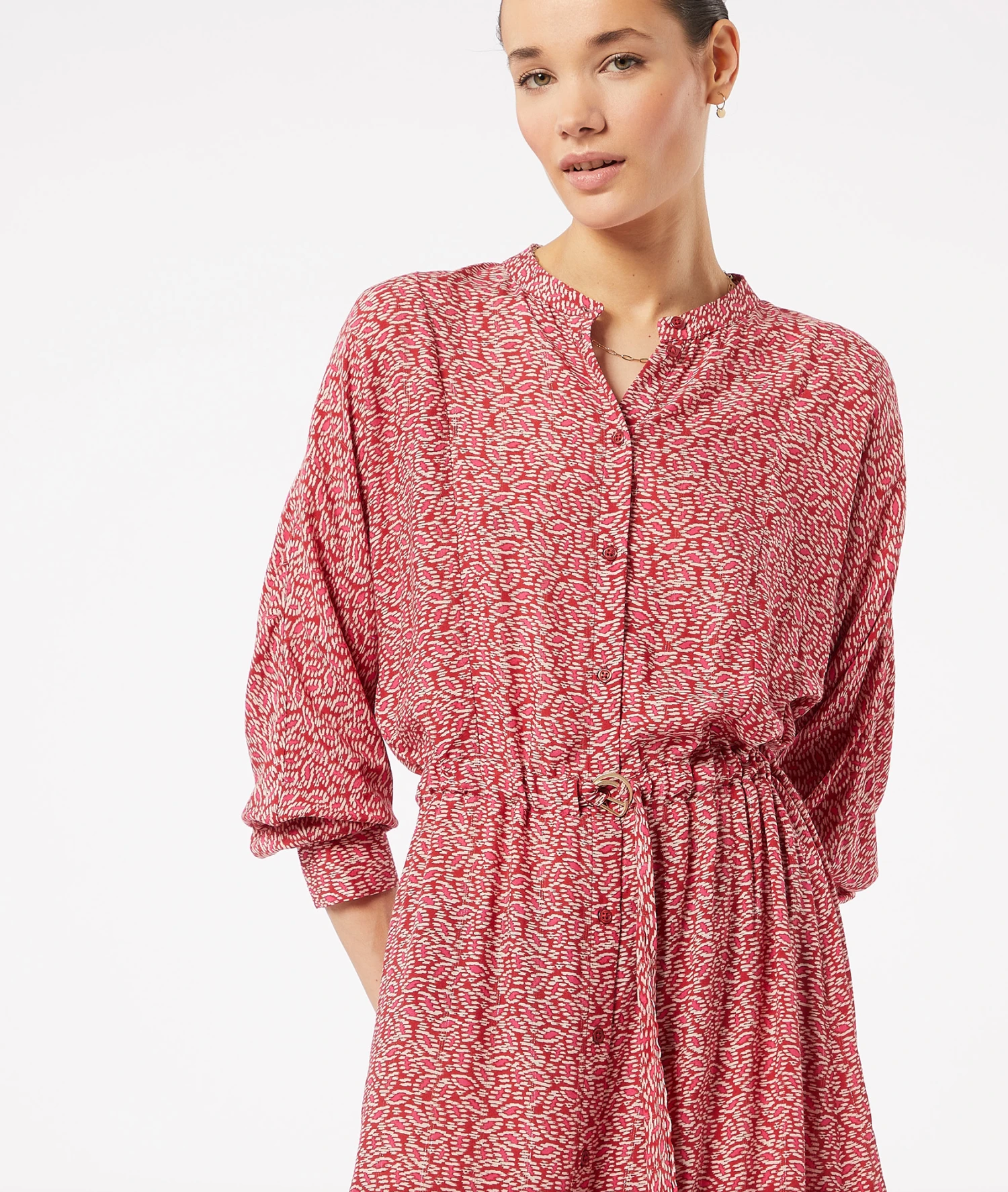 Leichtes florales Kleid mit langen Ärmeln und einem schmalen Gürtel, das die Taille betont. Mit Stiefeln leicht zum einem Casual-Look zu verwandeln.