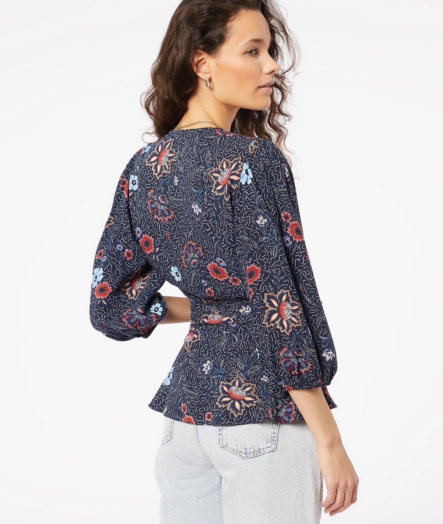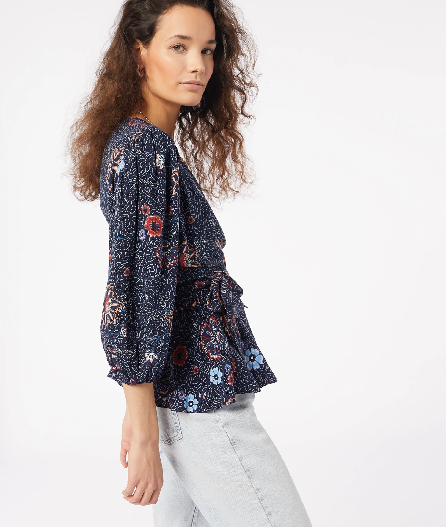 Wickelbluse mit dezentem Gürtel in der Taille, floralem Print und voluminösen Ärmeln.